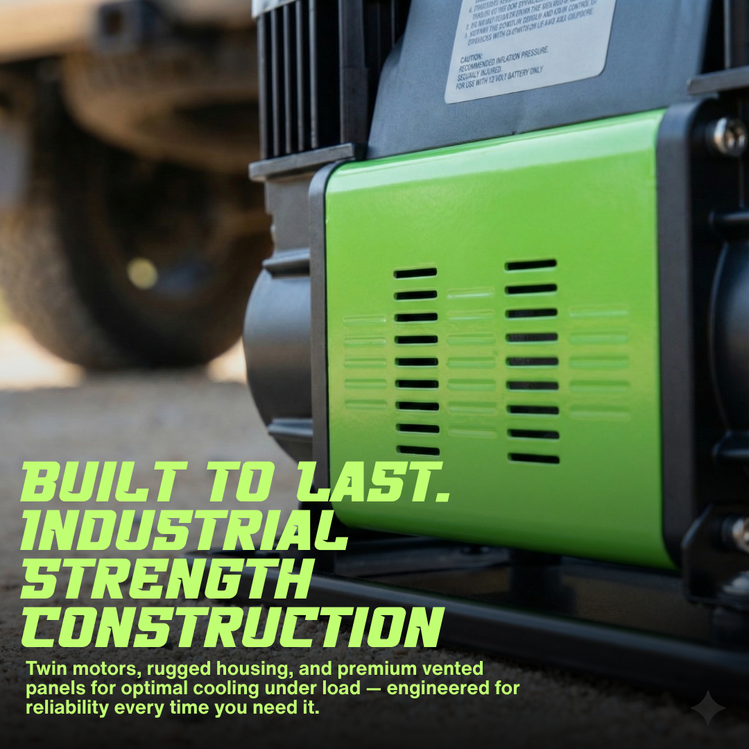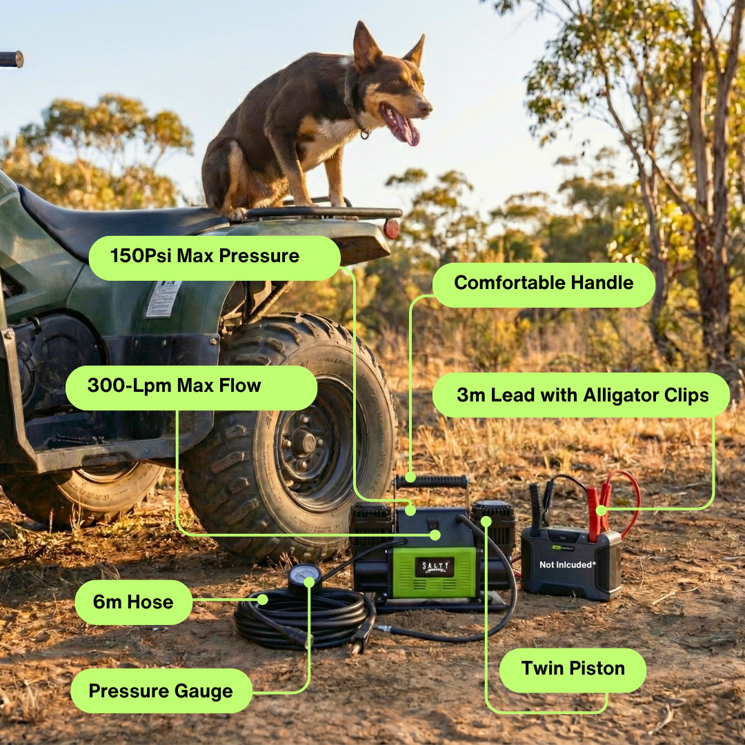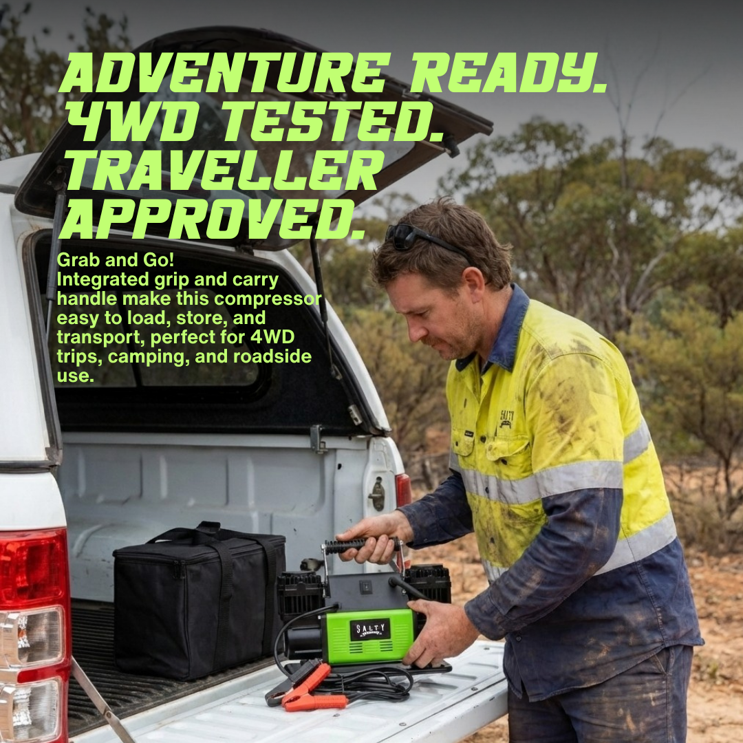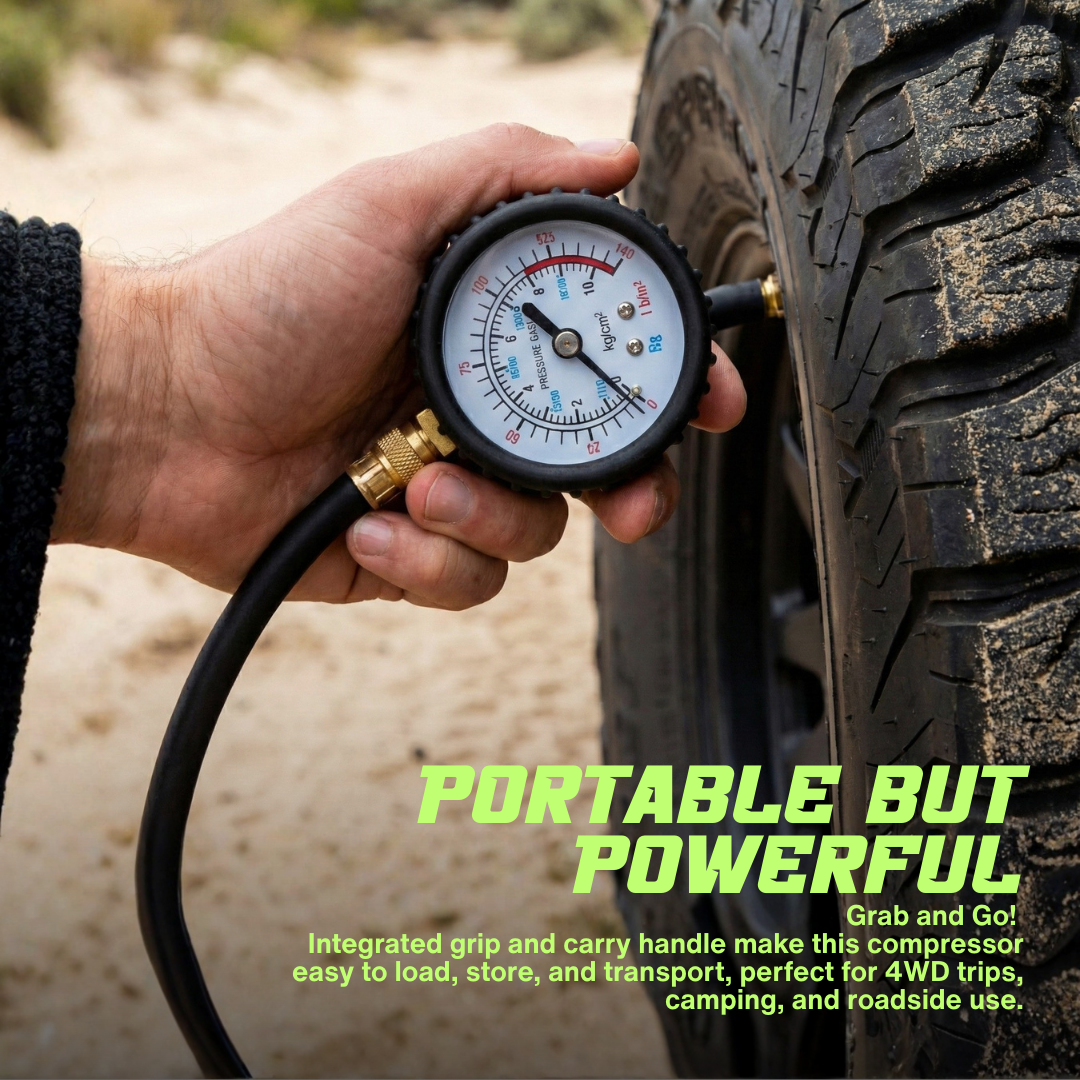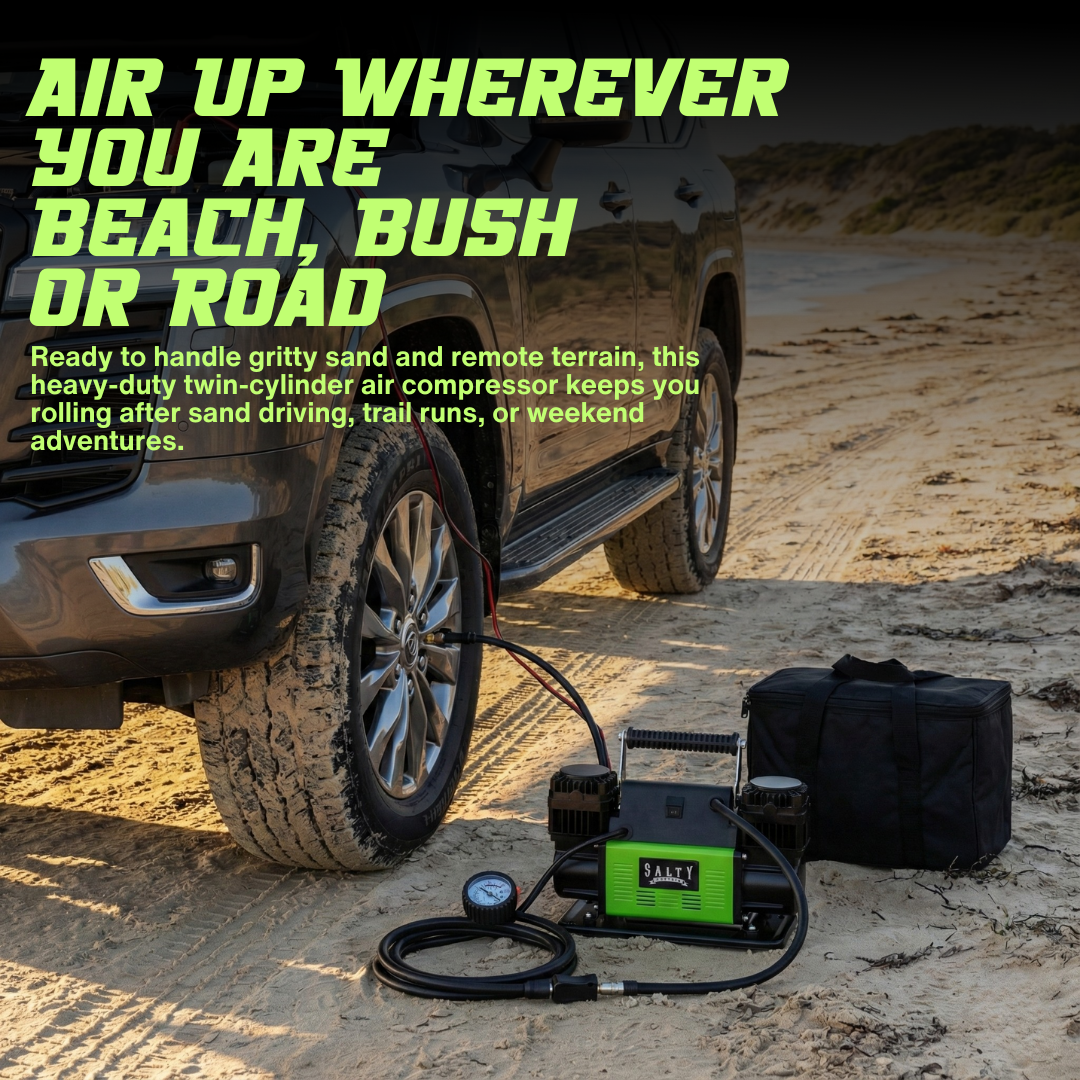 A high-output twin cylinder air compressor designed for rapid tyre inflation after beach or off-road driving.