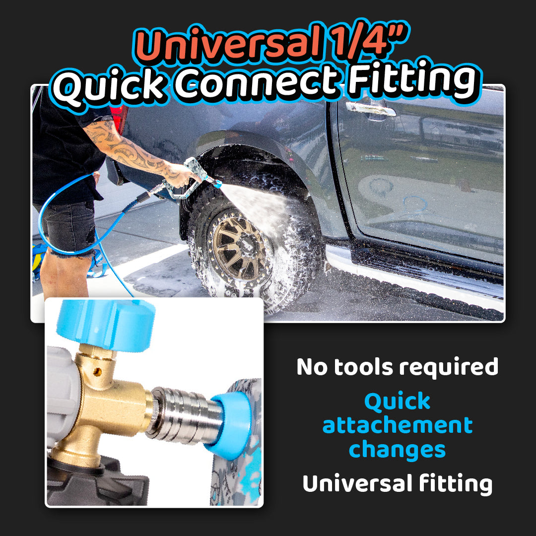 - Connect Accessories: Ensure your pressure washer is off. Simply attach your 1/4" quick-connect nozzle, foam cannon, or extension lance to the front of the detail gun.