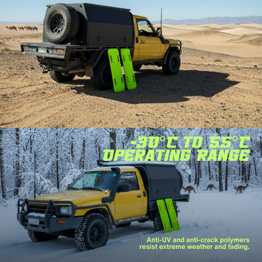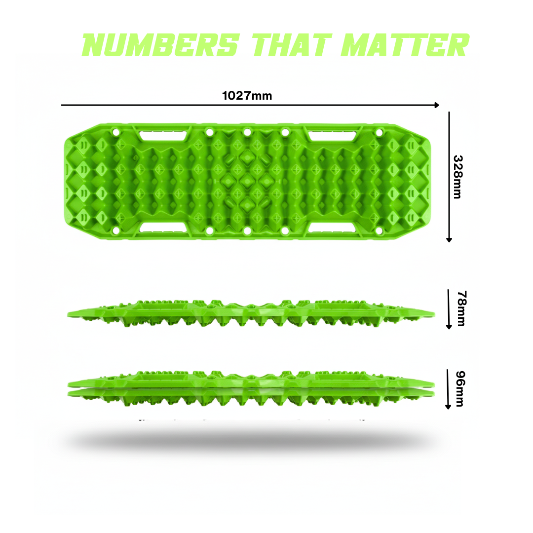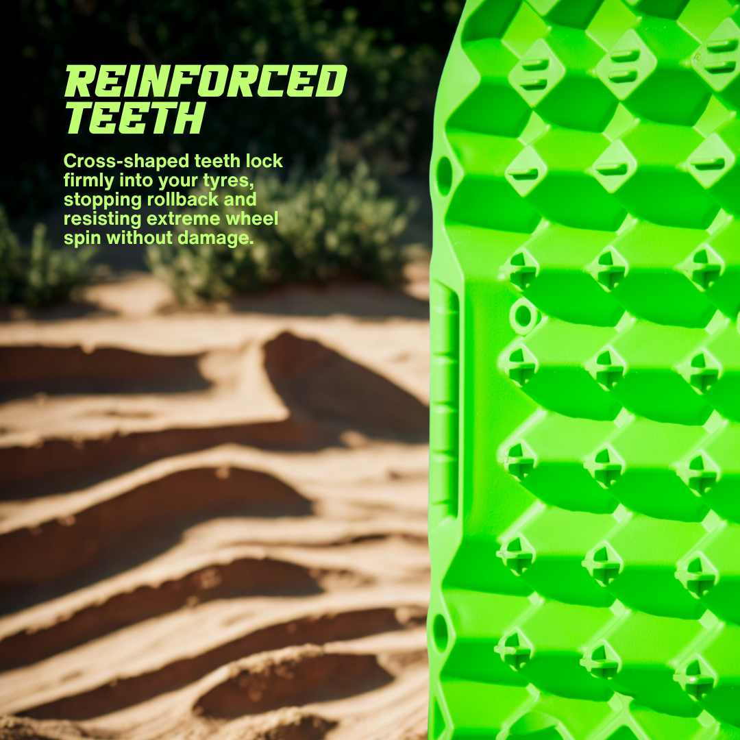 Get unstuck fast with UV-stabilised polypropylene boards engineered for sand, mud and snow. Fixed star-knob teeth bite hard into your tyres for reliable traction.