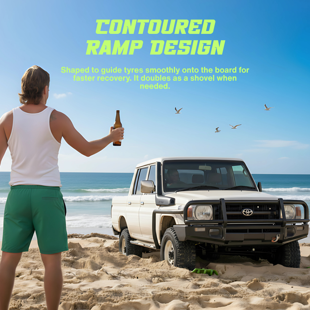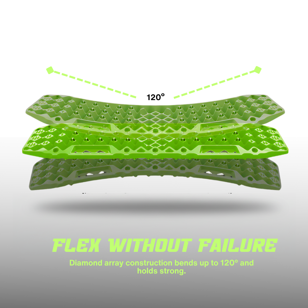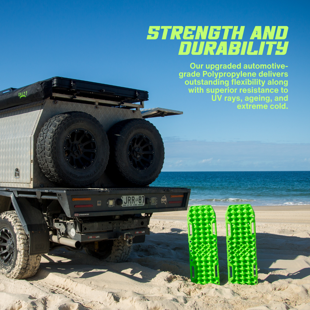 Get unstuck fast with UV-stabilised polypropylene boards engineered for sand, mud and snow. Fixed star-knob teeth bite hard into your tyres for reliable traction.
