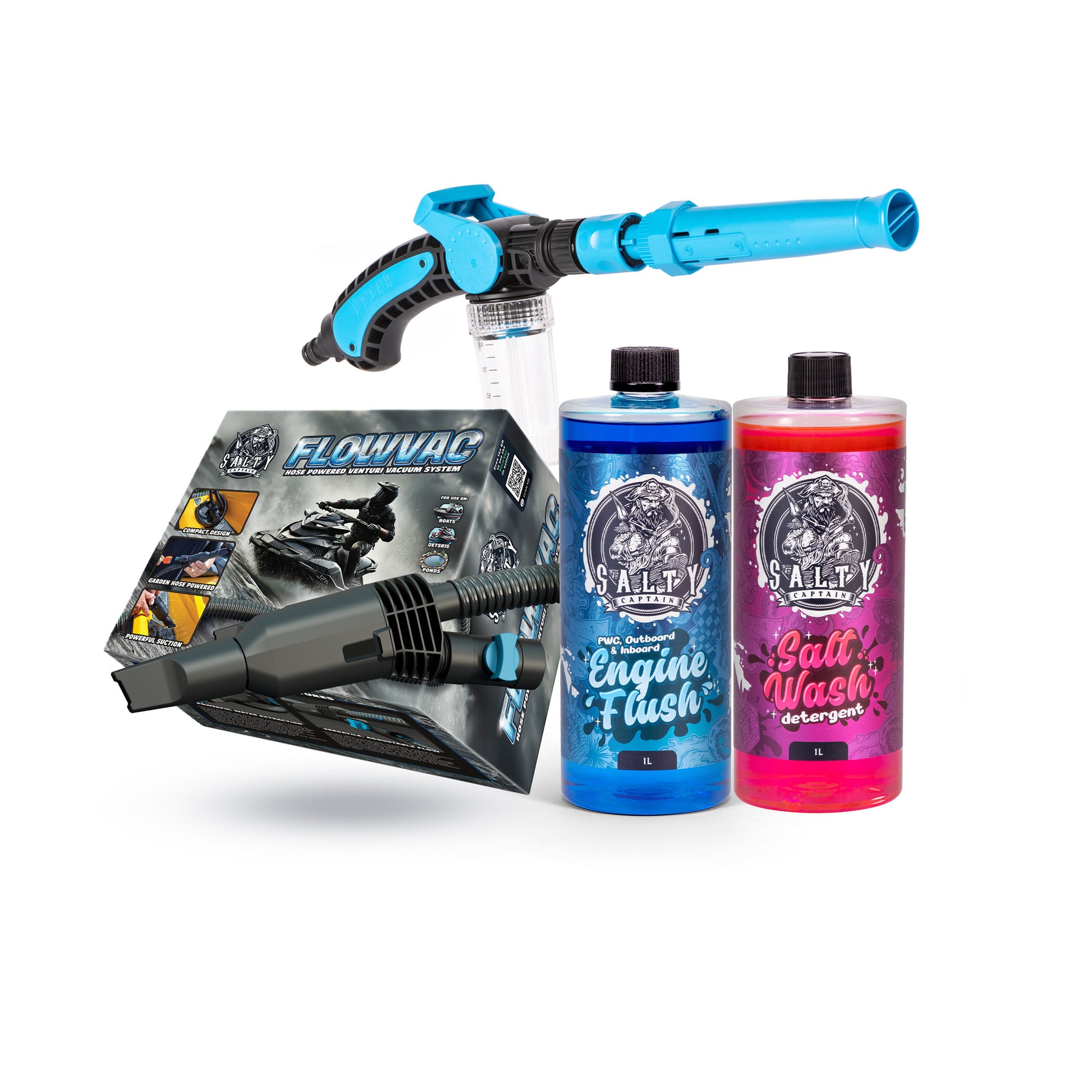 The FlowVac Rescue Kit is a cost-effective bundle that lets you stock up on essential marine cleaning solutions while also getting your hands on the new FlowVac Water Vacuum. Perfect for those who already own The Captain’s Musket, this kit includes 1L Salt Wash Detergent and 1L Engine Flush Solution, giving you everything needed to flush, clean, and protect your boat or PWC from salt and corrosion.